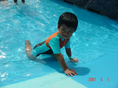 Amek half day leave. Tengahari abis kerja terus ke rumah kakak kat Desa Pandan. Hubby solat Jumaat, while aku buat banking sket. Settle semua around 2:30p.m. we all pun bertolak. Journey was ok (macam nak gi jauh..hee..hee..). Sampai ke sana, after checking in, Rizq tak sabar sabar nak ke swimming pool. Aku yang tak boleh bermandi manda swimming pool ni terpaksa suruh Tina yang bawak Rizq ke pool.